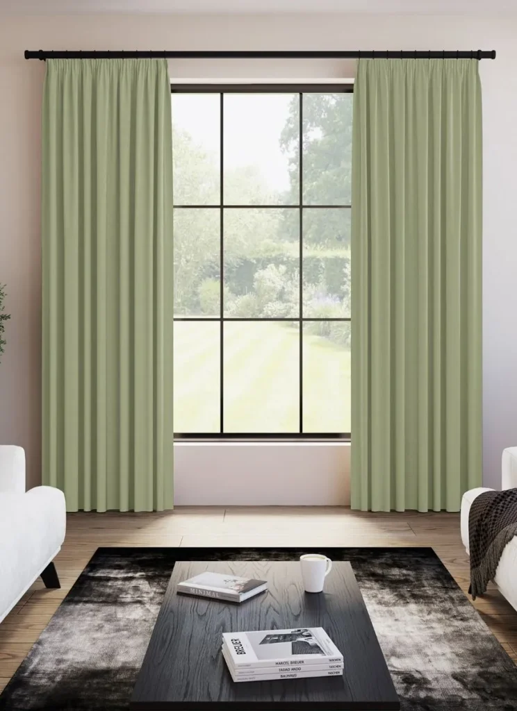 Saffron Apple Office Curtains are crafted from textured polyester with a blackout finish for enhanced light control. Designed with a pencil pleat heading, they offer a calm, professional look while improving privacy and comfort in office and shared spaces.